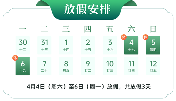 放假时间:4月4日(星期六)至4月6日(星期一),共3天。